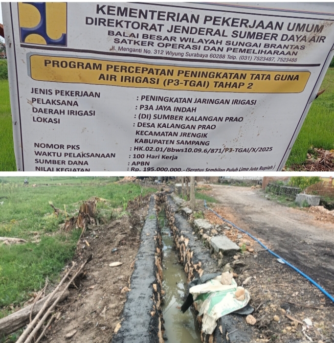 SAMPANG,jejakperistiwa.online-Proyek saluran irigasi P3-GAI tahap 2 yang dikerjakan melalui P3A Jaya Indah di Sumber Kalangan Prao Desa Kalangan Prao Kecamatan Jrengik Kabupaten Sampang menuai perhatian publik.Senin,03/11/2025.