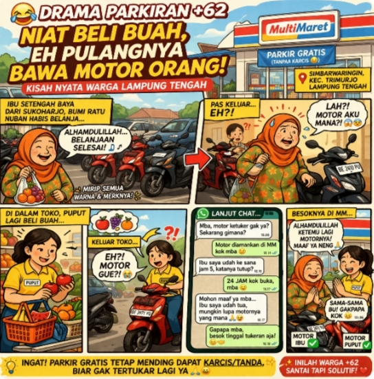 Kejadian unik ini terjadi di salah satu minimarket (MM) di Simbarwaringin, Kecamatan Trimurjo. Seorang ibu setengah baya, warga Kampung Sukoharjo, Kecamatan Bumi Ratu Nuban, niat hati cuma belanja biasa… eh pulangnya malah “upgrade” motor tapi punya orang lain! 🤣
