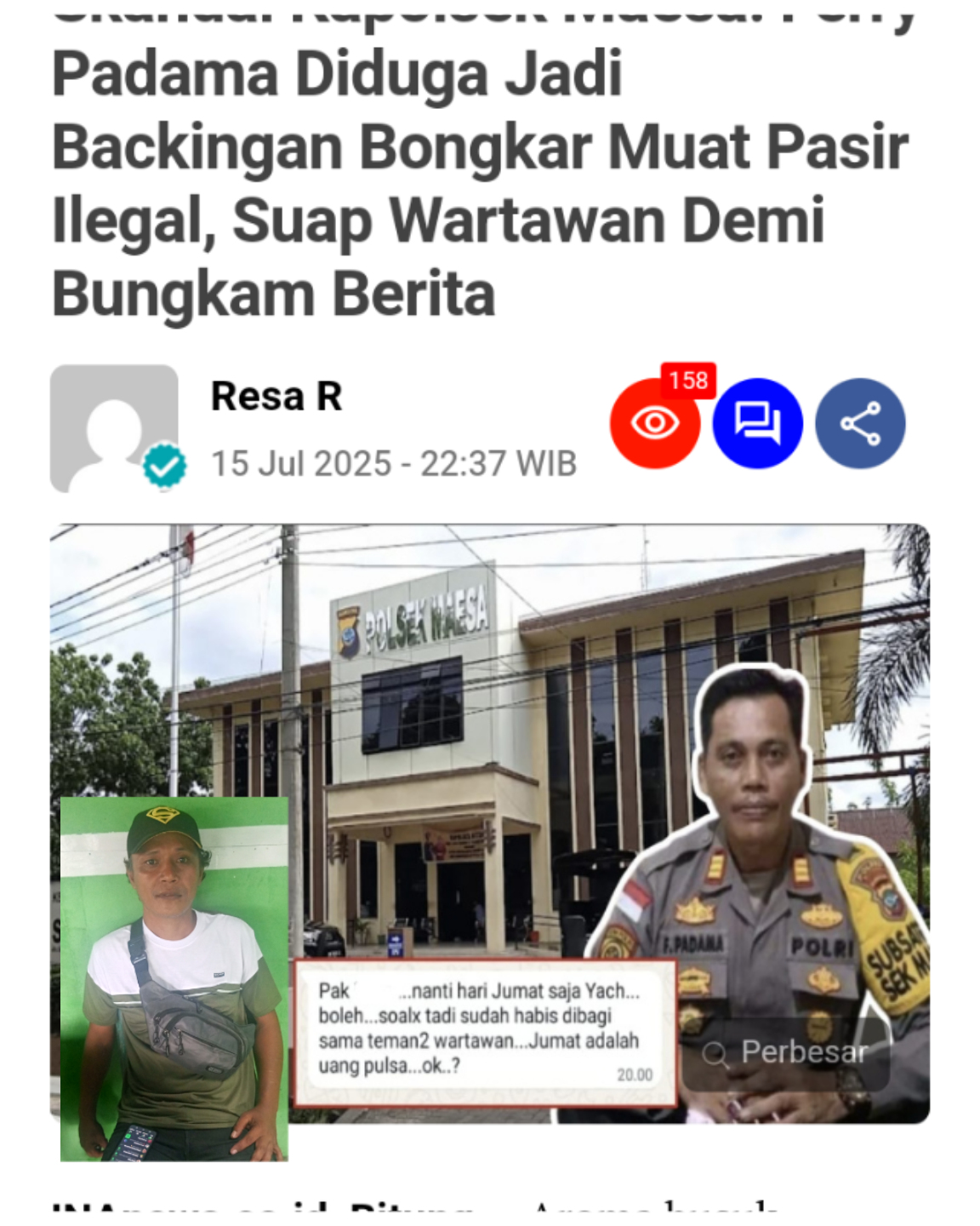Jejakperistiwa.Online, Bitung — Dunia jurnalisme lokal di Kota Bitung tengah diguncang polemik setelah munculnya pemberitaan kontroversial di salah satu media online dengan judul mencolok : “Skandal Kapolsek Maesa! Ferry Padama Diduga Jadi Backingan Bongkar Muat Pasir Ilegal, Suap Wartawan Demi Bungkam Berita.”