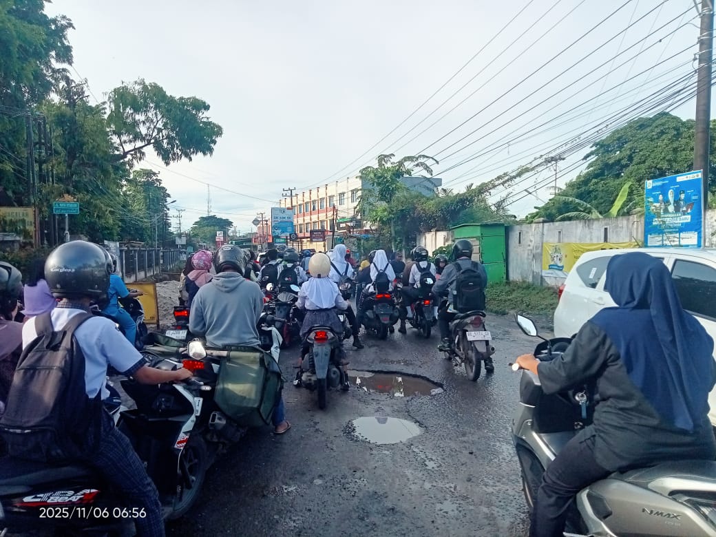 METRO – Kemacetan dan bahaya kecelakaan mengintai pengguna Jalan Tejo Agung, Kecamatan Metro Timur. Jalur utama penghubung Kota Metro dengan Kabupaten Lampung Timur ini kini berubah menjadi titik rawan akibat kondisi jalan berlubang dan proyek drainase yang amburadul.