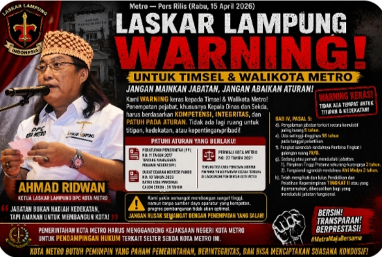 Metro — Ketua Laskar Lampung Indonesia DPC Kota Metro, Ahmad Ridwan, melontarkan peringatan keras dan tanpa kompromi kepada Tim Seleksi (Timsel) serta Wali Kota Metro terkait proses seleksi terbuka (selter) sejumlah jabatan strategis di lingkungan Pemerintah Kota Metro.