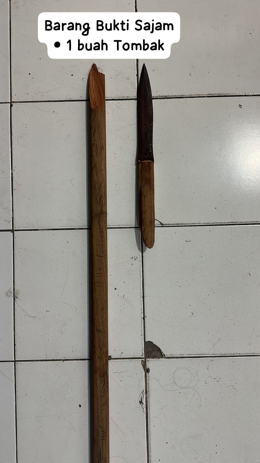 Dalam proses penangkapan, polisi juga mengamankan barang bukti berupa sebuah tombak berbahan besi dengan gagang kayu. Panjang tombak tersebut sekitar 2 meter dengan mata tombak sepanjang ±23 cm dan lebar sekitar ±3,1 cm.