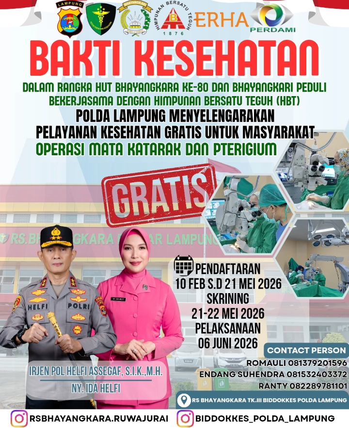 “Melalui bakti kesehatan ini, Polda Lampung ingin memberikan akses layanan operasi mata secara gratis kepada masyarakat yang membutuhkan, sebagai wujud pengabdian Polri dalam momentum Hari Bhayangkara,” ujarnya, Kamis (9/4/2026).