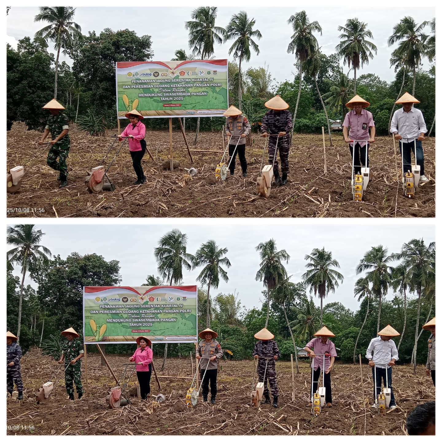 Jejakperistiwa.Online, Bitung — Dalam upaya mendukung program Swasembada Pangan Nasional 2025 serta mewujudkan visi Nawacita dan Astacita Presiden RI, Polres Bitung menggelar kegiatan penanaman jagung serentak kuartal IV sekaligus peresmian Gudang Ketahanan Pangan Polri di Kelurahan Manembo – nembo, Kecamatan Matuari, Kota Bitung, Rabu (8/10/2025).