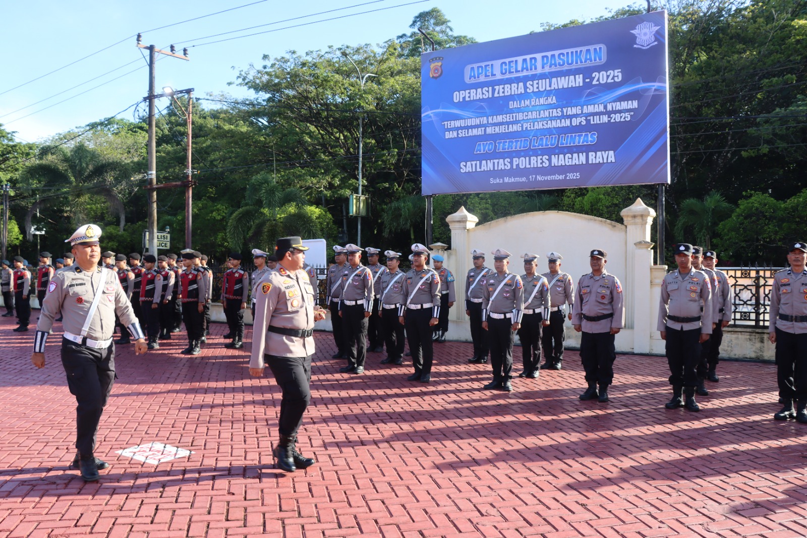 Nagan Raya — Senin, 17 November 2025 pukul 08.00 WIB, Polres Nagan Raya melaksanakan Apel Gelar Pasukan Operasi Zebra Seulawah Tahun 2025 di Lapangan Apel Polres Nagan Raya. Kegiatan berlangsung dengan khidmat, tertib, dan penuh semangat kolaborasi lintas instansi demi meningkatkan keamanan, keselamatan, ketertiban, dan kelancaran lalu lintas (Kamseltibcarlantas) di Kabupaten Nagan Raya.