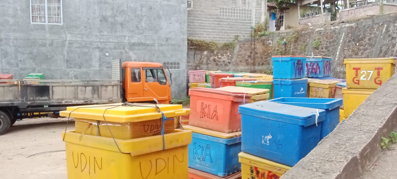 Di dalam area terlihat puluhan kotak fiber pendingin yang lazim digunakan untuk penyimpanan ikan sebelum distribusi. Kendaraan pickup hingga truk keluar masuk secara bergantian.